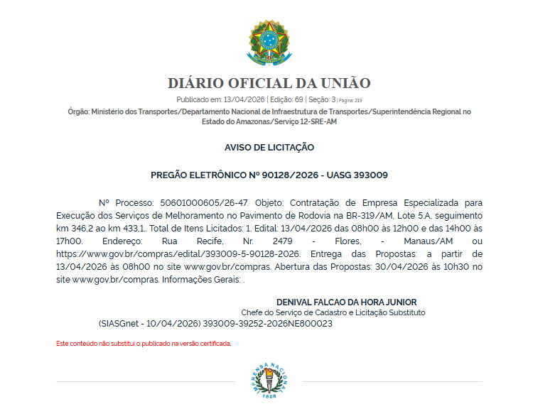 A BR-319 deu mais um passo importante rumo à sua recuperação com a publicação, no Diário Oficial da União (DOU) desta segunda-feira (13/04), de novos avisos de licitação do Departamento Nacional de Infraestrutura de Transportes (DNIT). O edital prevê a contratação de empresas para executar serviços de melhoramento em diferentes trechos da rodovia, considerada estratégica para a integração regional, o escoamento da produção e a redução do isolamento do Amazonas.