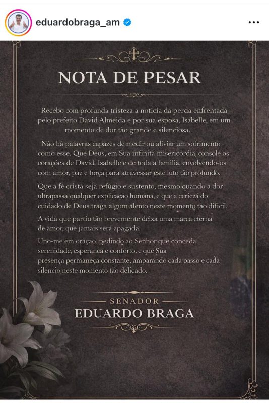 Os senadores Omar Aziz e Eduardo Braga também divulgaram notas de pesar em solidariedade ao prefeito e à primeira-dama. Omar classificou a morte de um filho como uma “dor inominável e irreparável”, enquanto Eduardo afirmou que “não há palavras capazes de medir ou aliviar um sofrimento como esse”.