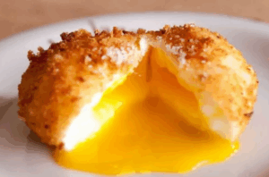 Como funciona: o ovo pochê (previamente cozido) é empanado rapidamente em panko e frito (sem passar do ponto). O interior fica líquido.