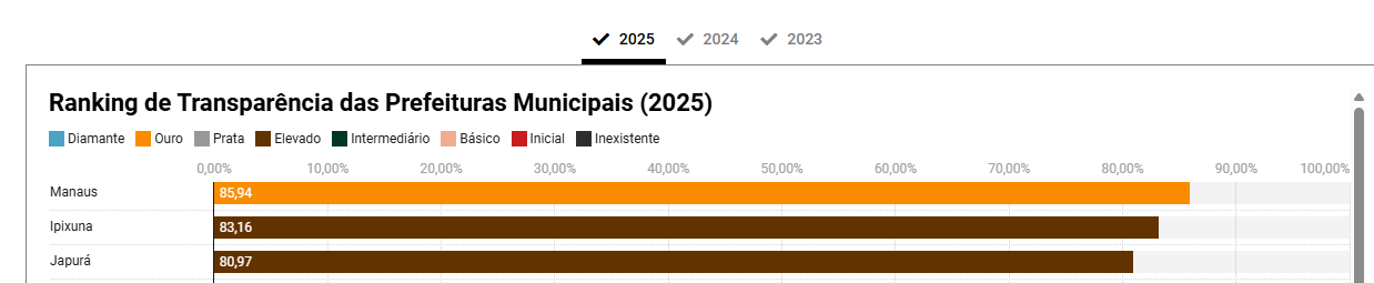 No topo da lista, a Prefeitura de Manaus lidera com índice de transparência de 85,95%, garantindo classificação ouro e destacando-se como a administração municipal mais acessível em termos de informação pública no Amazonas. Logo atrás, Ipixuna (83,16%) e Japurá (80,97%) figuram entre os melhores desempenhos, superando cidades tradicionalmente maiores e com maiores orçamentos municipais.