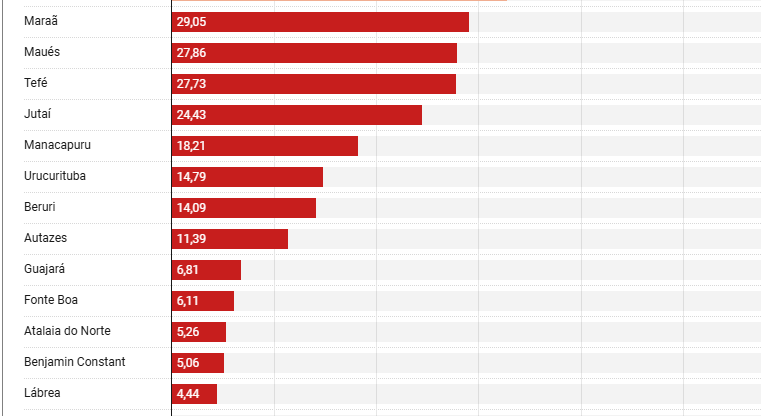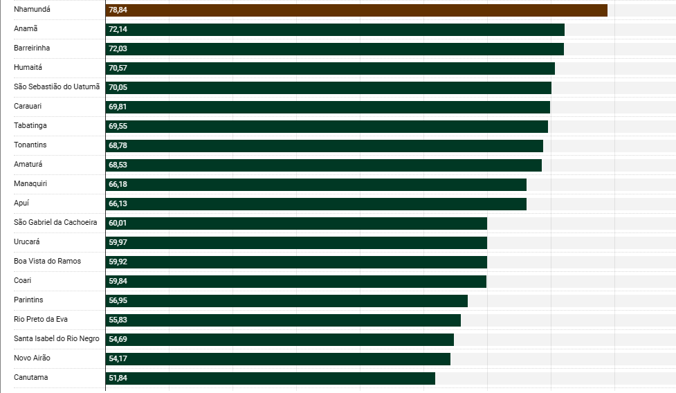 Outros municípios também aparecem com índices considerados bons ou intermediários, como Anamã, Barreirinha e Humaitá, com pontuações acima de 70%, mostrando que práticas responsáveis de gestão pública e divulgação de informações podem acontecer em diferentes tamanhos de cidades.