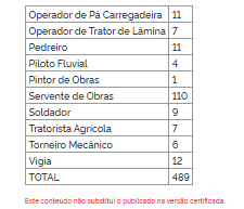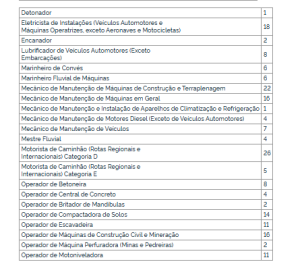 Entre os cargos autorizados estão engenheiros, técnicos em obras civis, técnicos em segurança do trabalho, contadores, assistentes administrativos, além de mecânicos, operadores de máquinas pesadas, motoristas, pedreiros e serventes de obras. O maior número de vagas é destinado à função de servente de obras, com 110 oportunidades.