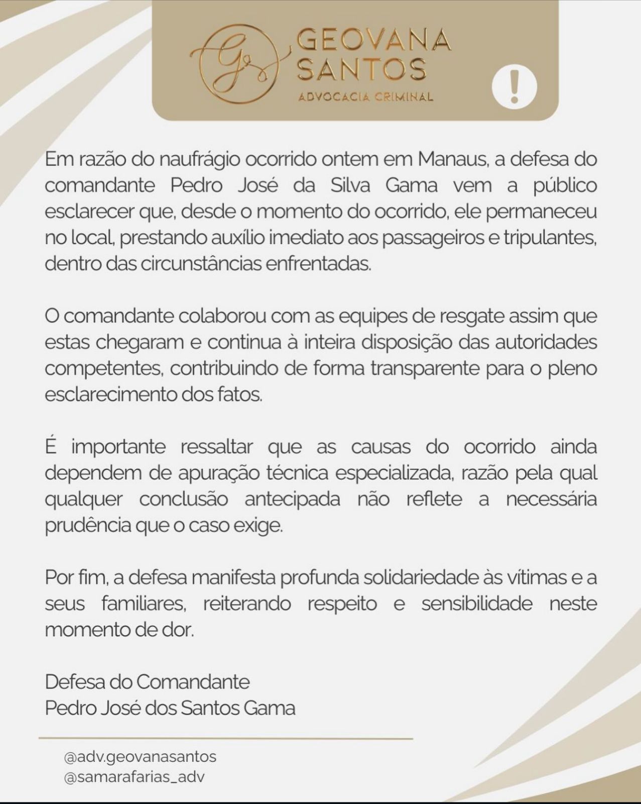 Em nota oficial, a defesa do comandante da lancha Lima de Abreu XV, identificado como Pedro José da Silva Gama, disse que ele colaborou com as equipes de resgate assim que elas chegaram ao local do acidente e segue à dispotição das autoridades policiais e da Marinha do Brasil.