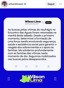 Ainda na manhã de hoje (14/02), o governador do Estado Wilson Lima (UB) voltou a se solidarizar com as famílias das vítimas e reafirmou o compromisso com a força-tarefa montada para encontrar os desaparecidos.