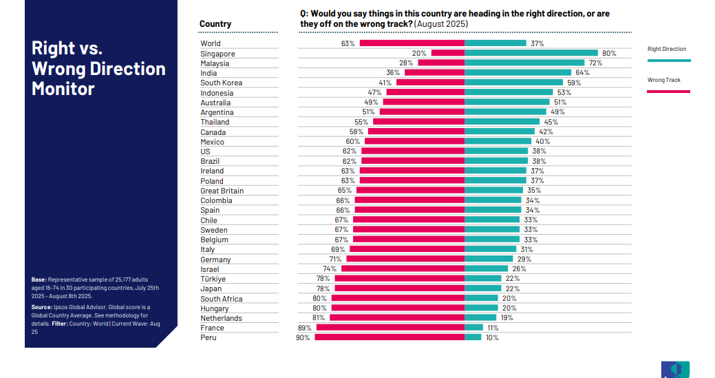 Pesquisa global revela que 62% dos brasileiros acreditam que o país segue na direção errada
