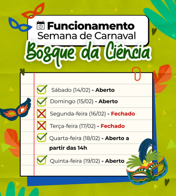 O Bosque da Ciência do Inpa costuma fechar durante o período de Carnaval (segunda e terça-feira), reabrindo na Quarta-Feira de Cinzas à tarde. Geralmente, o local funciona normalmente no sábado e domingo que antecedem o feriado. É recomendável agendar a visita antecipadamente pelo site oficial do bosque.