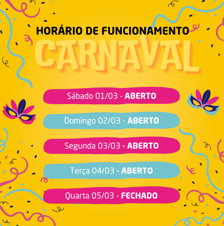 Sábado e Domingo de Carnaval: Funcionamento normal (visitação de manhã e à tarde).
