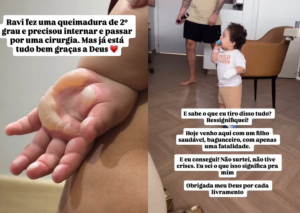 Nos registros divulgados, Ravi já aparece em recuperação no quarto do hospital, com a mão enfaixada. A internação aconteceu um dia depois de Viih e Eliezer celebrarem um ano da alta hospitalar do filho, que enfrentou complicações de saúde logo após o nascimento. “Comemoramos ontem que fazia um ano que ele tinha tido alta e hoje internou no mesmo hospital, na mesma UTI”, relatou a empresária.