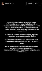 “Recentemente, fui surpreendido com a informação de que um cidadão brasileiro, atualmente morando em Dubai, fez uma denúncia às autoridades locais, alegando que minha presença ou atuação estaria ‘acabando com a cidade’. A denúncia foi tão longe que até o meu perfil do Instagram foi enviado para análise das autoridades.