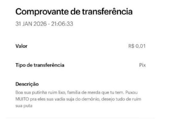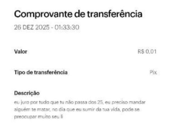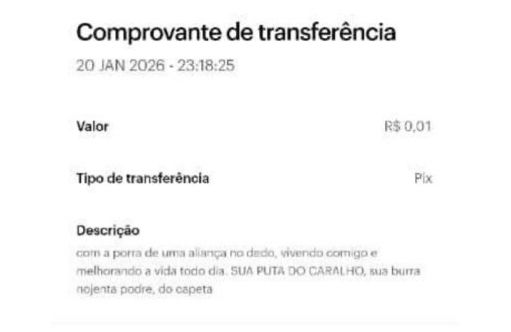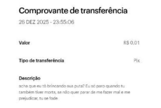 Após ter todos os seus números de telefone bloqueados, o suspeito passou a usar o sistema de transferência bancária para assediar a ex-companheira. Em uma das transações de apenas 1 centavo, ele escreveu na mensagem do Pix: “Eu só paro quando tu também tiver morta, se não quer para de me fazer mal e me prejudicar, tu se f*de”.