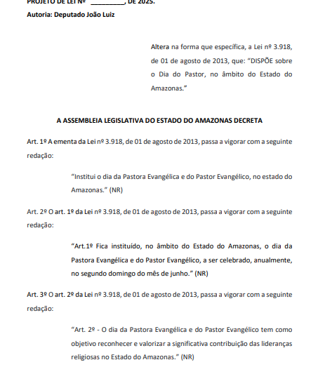 A Assembleia Legislativa do Amazonas aprovou durante a sessão desta quinta-feira (11/12) o projeto de lei do deputado estadual João Luiz (Republicanos), que reformula a Lei nº 3.918/2013 e institui oficialmente o Dia da Pastora Evangélica e do Pastor Evangélico no estado. A proposta segue agora para sanção do governador.