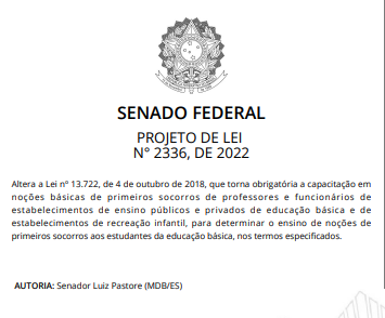 O ensino de noções básicas de primeiros socorros para estudantes da educação básica deu mais um passo no Senado. O Projeto de Lei 2.336/2022, de autoria do ex-senador Luiz Pastore, foi aprovado na Comissão de Assuntos Sociais nesta quarta-feira (18/03) e agora segue para análise em turno suplementar antes de ser encaminhado à Câmara dos Deputados.
