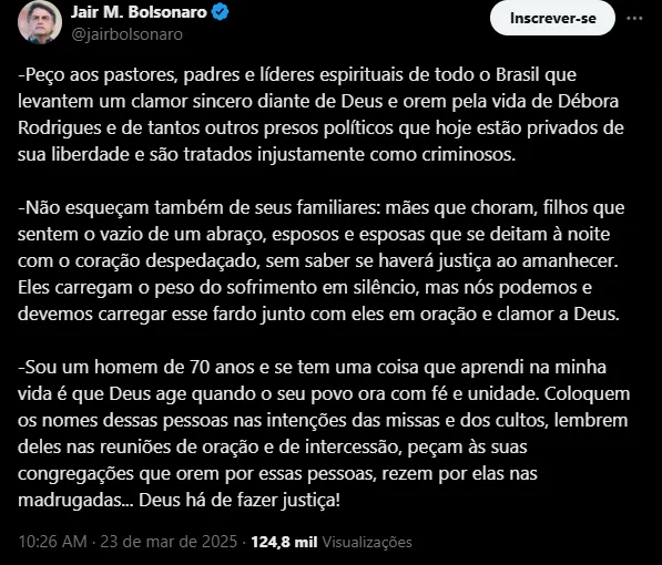Bolsonaro pede orações por mulher que pichou “Perdeu, mané” em estátua