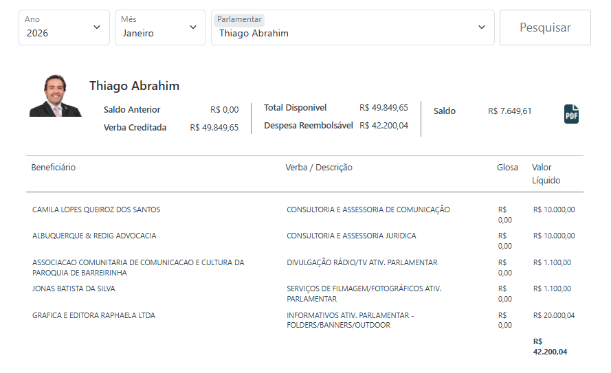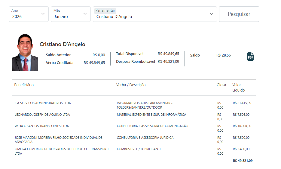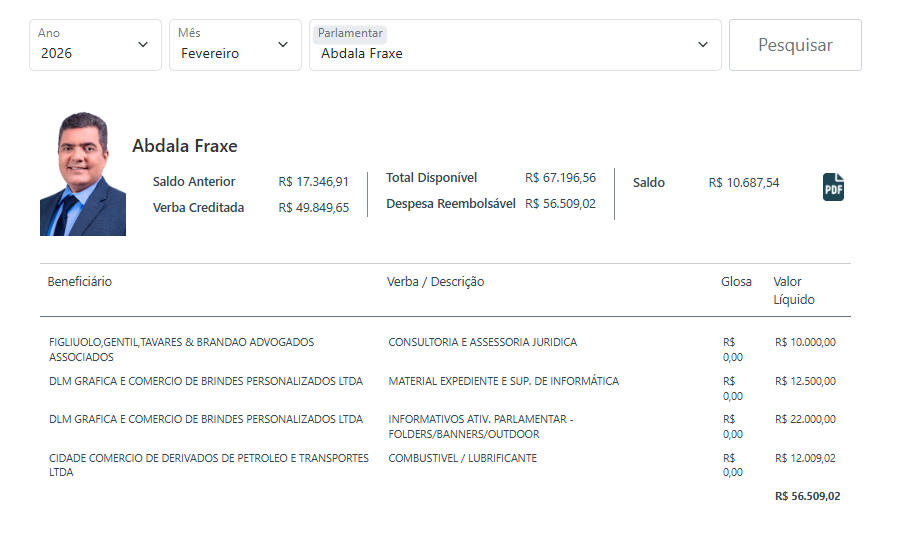 Em janeiro, os números já impressionavam. Cristiano D`Ângelo (MDB) gastou R$ 21.415,09 em materiais gráficos; Thiago Abrahim (MDB), com R$ 20 mil, e Rozenha (PSD) com R$ 22,4 mil. Wanderley Monteiro (UB) chamou atenção ao somar R$ 30 mil, incluindo gastos com divulgação digital ou informativos parlamentares.