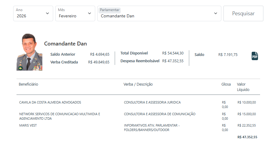 Fevereiro elevou ainda mais o ritmo. Cabo Maciel (PL) passou dos R$ 22,4 mil, enquanto Comandante Dan (Republicanos), Sinésio Campos (PT) e Abdala Fraxe (Avante) também tiveram os R$ 22 mil em informativos. Cristiano D`Ângelo (MDB) e Alessandra Campelo (PSD) com de R$ 21 mil e Rozenha (PSD) chegou a R$ 21.090.