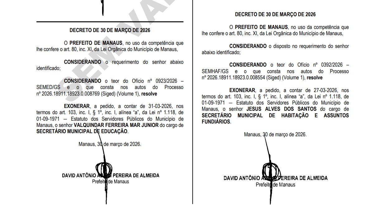 Um dos últimos atos de David Almeida (Avante) como prefeito de Manaus foi exonerar secretários, presidentes de fundações, conceder reajuste de salários e trocar membros de conselhos municipais. Estes atos foram publicados na edição do Diário Oficial do Município divulgada na noite desta segunda-feira (30/3).