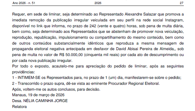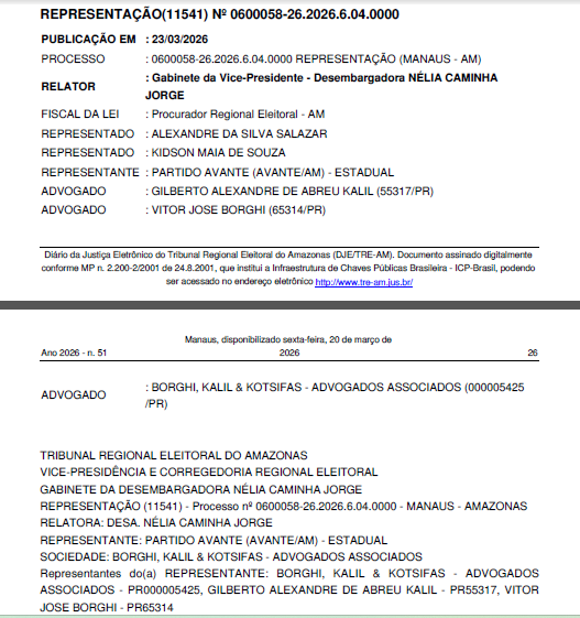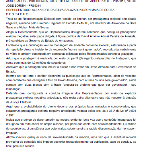 Outra representação, de nº 0600058-26.2026.6.04.0000, foi movida pelo partido Avante contra Alexandre da Silva Salazar (Sargento Salazar) e Kidson Maia de Souza (Kidson Maia), por suposta propaganda eleitoral antecipada negativa contra o pré-candidato ao governo David Almeida. Antes de analisar o pedido de retirada do conteúdo, a relatora determinou a intimação dos acusados para manifestação, seguida de vista ao Ministério Público Eleitoral.