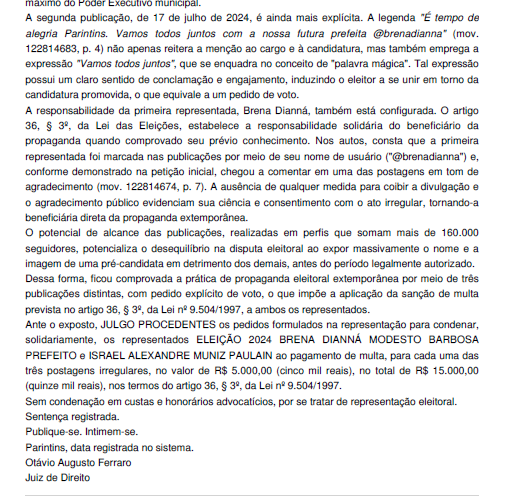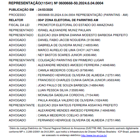 Em Parintins, na representação nº 0600668-50.2024.6.04.0004, Brena Dianná Modesto Barbosa (Brena Dianná) e Israel Alexandre Muniz Paulain (Isreal Paulain) foram condenados por propaganda eleitoral antecipada nas eleições de 2024. A decisão apontou três postagens em redes sociais com pedido implícito de voto antes do período permitido, resultando em multa total de R$ 15 mil.