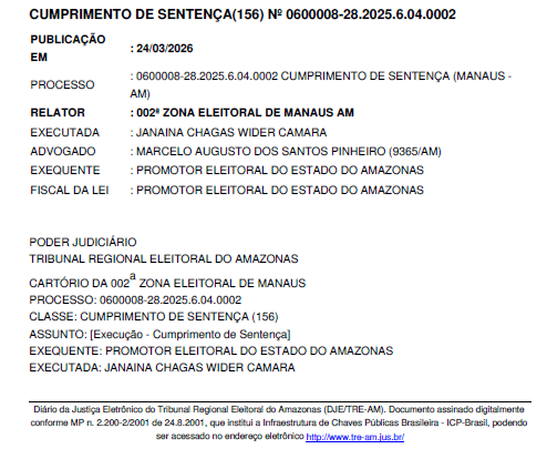 Já no processo nº 0600008-28.2025.6.04.0002, envolvendo Janaina Chagas Wider Câmara, a Justiça constatou pagamento parcial de multa eleitoral. Do total devido de R$ 6.367,50, foi quitado R$ 5.685,27, restando saldo de R$ 682,23. A executada foi intimada a pagar a diferença no prazo de cinco dias. Ela foi candidata a vereadora no pleito de 2024.