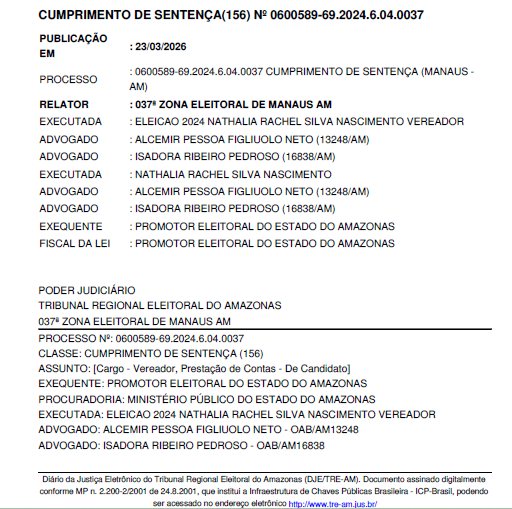 No cumprimento de sentença nº 0600589-69.2024.6.04.0037, a ex-candidata Nathalia Rachel Silva Nascimento, mais conhecida como Nath Nascimento, teve a cobrança de R$ 5.339,80 suspensa após acordo de parcelamento firmado pelo partido União Brasil, que assumiu a dívida. O processo foi arquivado provisoriamente, com possibilidade de retomada em caso de descumprimento.