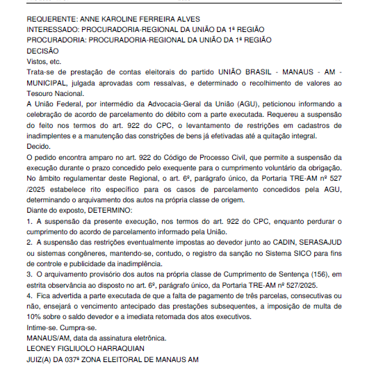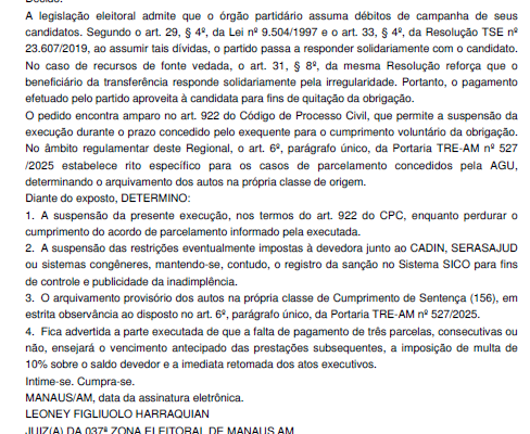 Por fim, na prestação de contas nº 0600582-77.2024.6.04.0037, referente ao partido União Brasil em Manaus, a Justiça aprovou as contas com ressalvas e determinou devolução de recursos. Com a formalização de acordo de parcelamento com a União, a cobrança foi suspensa e o processo arquivado provisoriamente, condicionado ao cumprimento do acordo.