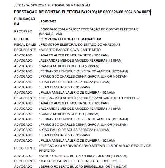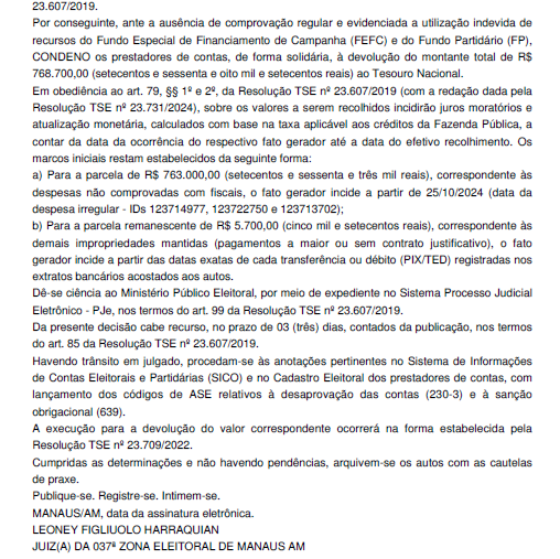 Na análise de contas de campanha, o processo nº 0600628-66.2024.6.04.0037 resultou na desaprovação das contas de Alberto Barros Cavalcante Neto (Capitão Alberto Neto) e Maria do Carmo Seffair Lins de Albuquerque (Maria do Carmo), candidatos à Prefeitura de Manaus em 2024. A Justiça identificou cerca de R$ 768,7 mil em uso irregular de recursos públicos, determinando a devolução ao Tesouro Nacional.
