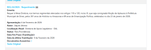 O parlamentar é o primeiro vice-presidente da Casa Legislativa, e alguns documentos constam no Protocolo (PROT) para Providências ou Gerência de Expediente (GEREXP) com o status de Deferido Pelo Presidente da Sessão da Aleam.