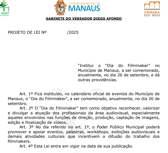 “Ao instituir o Dia do Filmmaker, o Município de Manaus contribui para o fortalecimento do setor cultural e da economia criativa local, estimulando o surgimento de novos talentos e incentivando a profissionalização da área”, justificou o parlamentar.