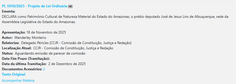Levantamento da Rede Onda Digital com base no Sistema de Apoio ao Processo Legislativo (SAPL) da Aleam mostra que Wanderley Monteiro protocolou 30 projetos de lei em 2023, primeiro ano de mandato. Em 2024, o número caiu para 19 propostas. Já em 2025, foram 23 projetos.