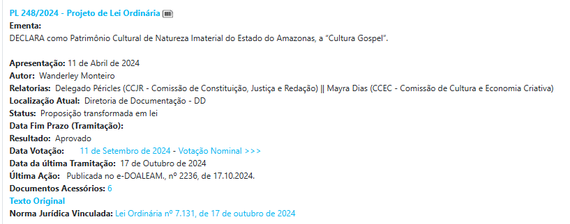 Mesmo assim, o parlamentar conseguiu aprovar dez projetos que foram sancionados pelo Governo do Amazonas em 2023, entre eles propostas que instituem datas de conscientização ou reconhecimento social, como o Dia do Portador da Síndrome de Tourette, o Dia Estadual do Catador de Materiais Recicláveis, a Semana Estadual do Sistema Braille nas escolas públicas e a Semana Estadual do Atleta Paralímpico.