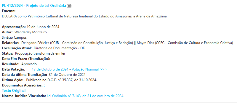 Entre os exemplos estão propostas como Dia do Despachante de Veículos, reconhecimento da Arena da Amazônia e da Ponte Jornalista Phelippe Daou como patrimônio cultural imaterial e datas voltadas a categorias profissionais.