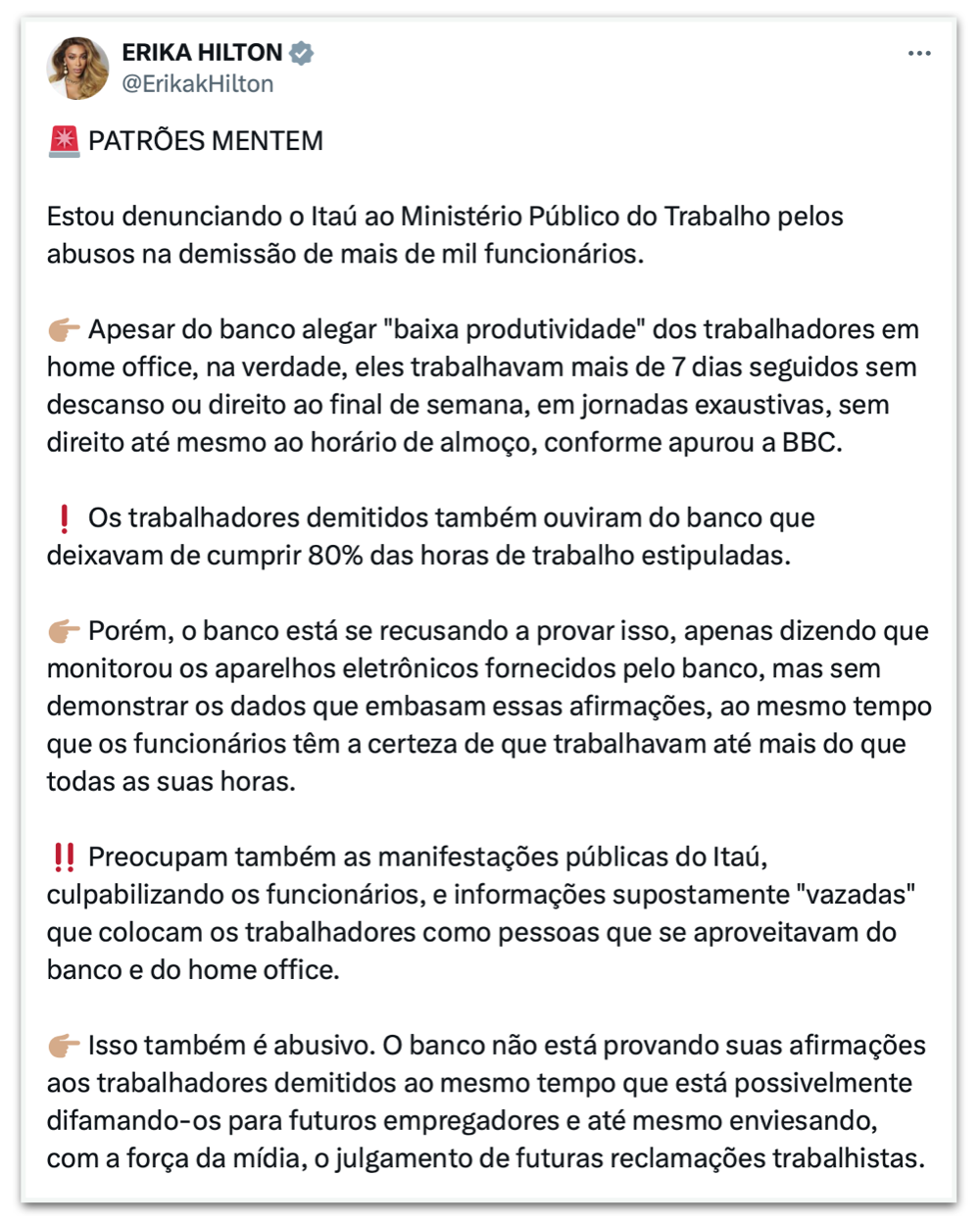 Erika Hilton pede investigação contra Itaú após demissão em massa de funcionários em home office