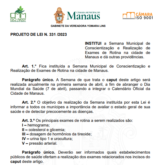 Está em tramitação na Câmara Municipal de Manaus (CMM) um Projeto de Lei (PL) da vereadora Yomara Lins (Podemos) que propõe a criação da Semana Municipal de Conscientização e Realização de Exames de Rotina. A iniciativa tem como objetivo incentivar os moradores da capital a realizarem exames preventivos e acompanharem sua saúde de forma contínua.