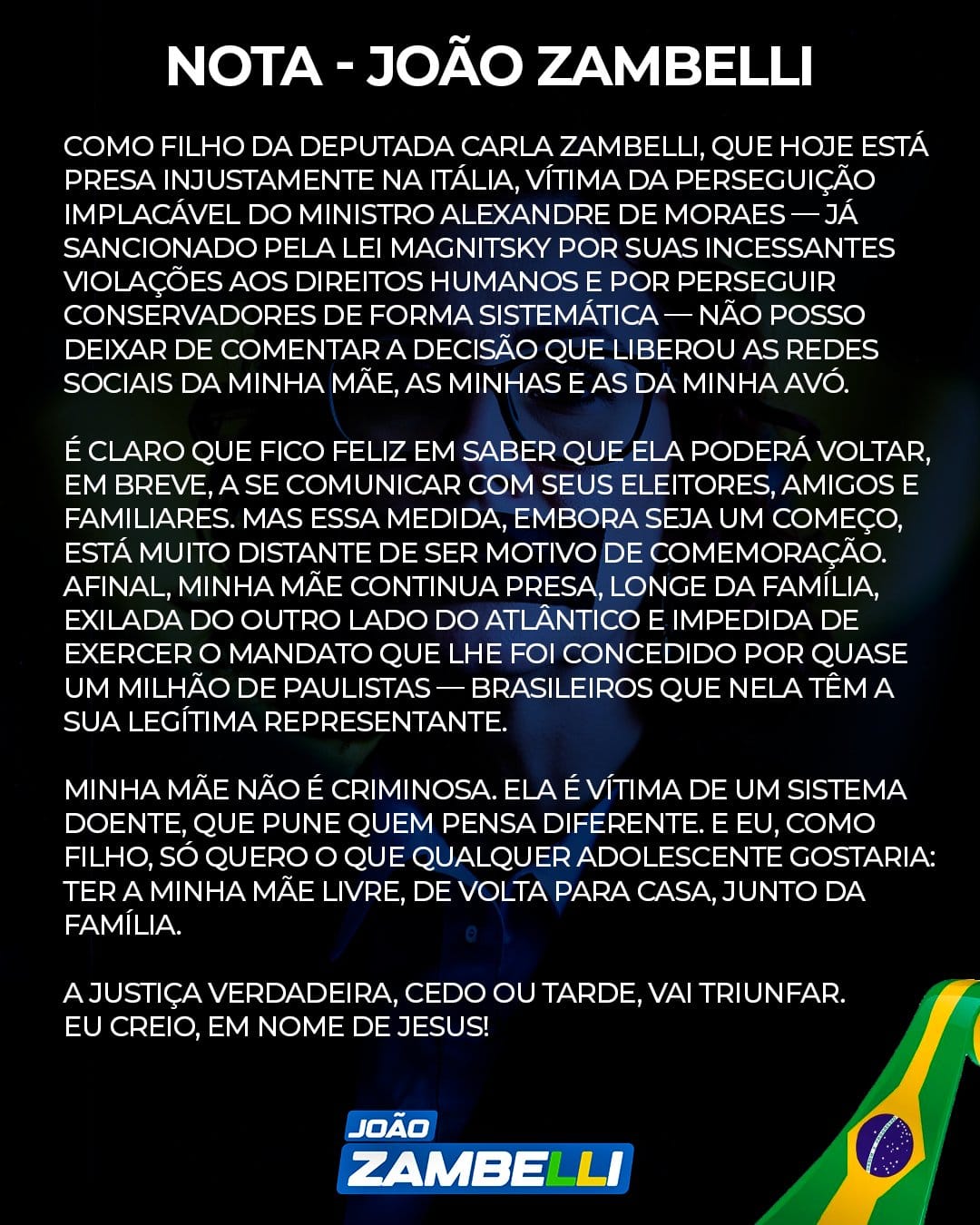 Após Moraes liberar redes sociais de Zambelli, filho da deputada reage: “Ela não é criminosa, é vítima”