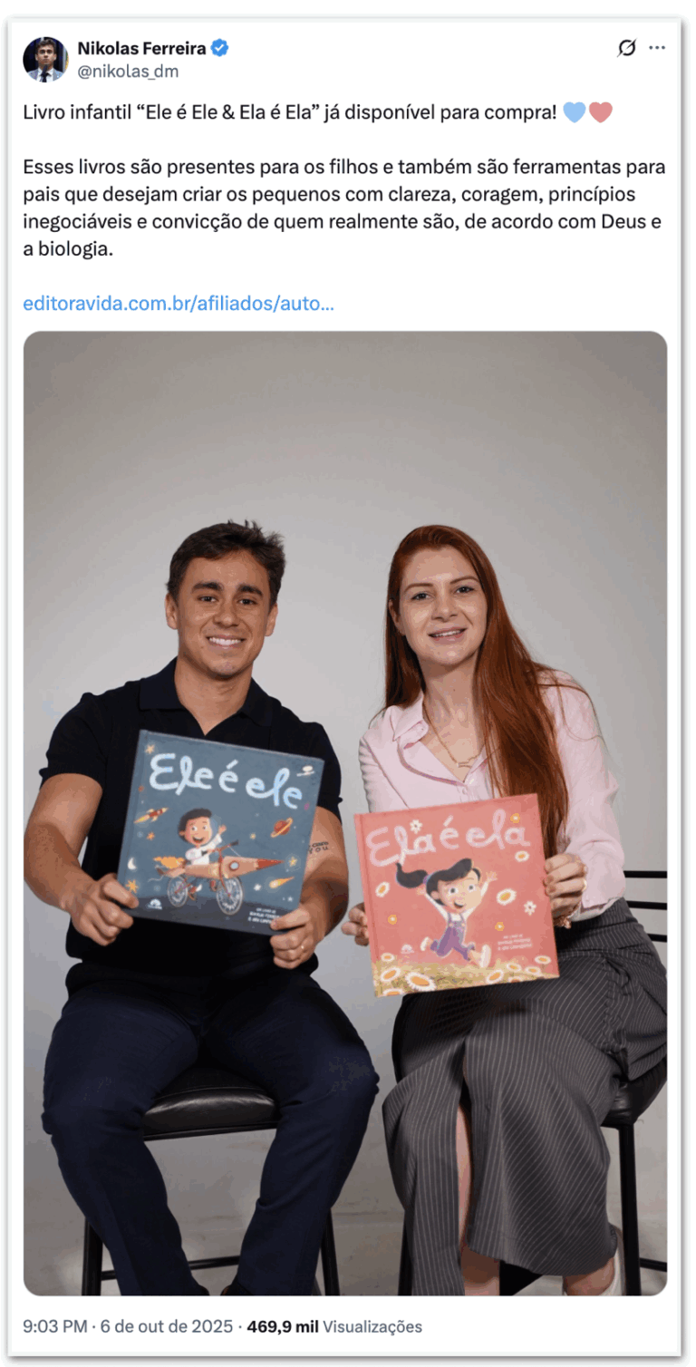 “Ele é Ele & Ela é Ela”: Nikolas Ferreira lança livros infantis sobre identidade de gênero