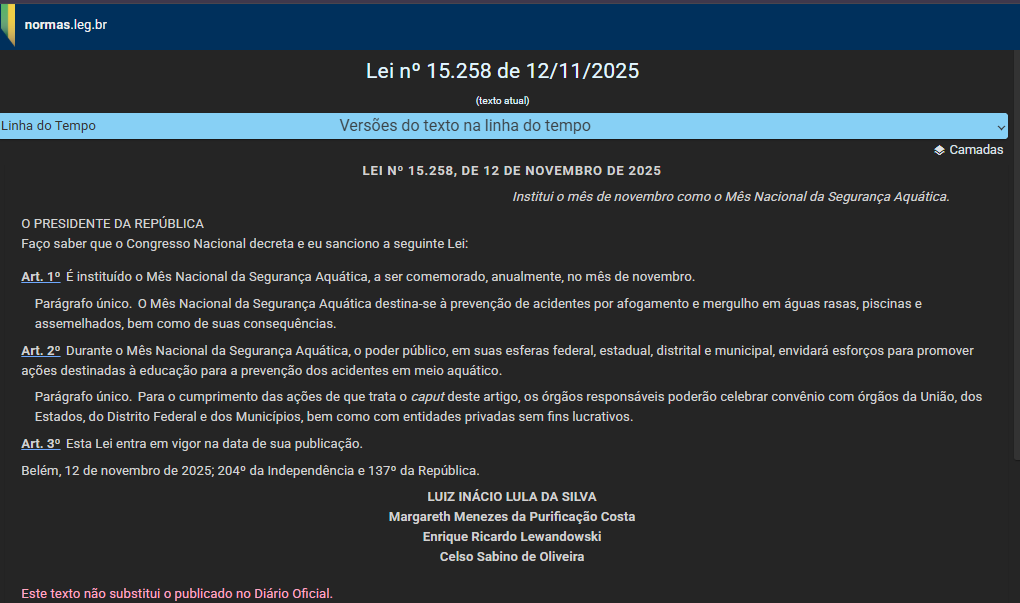 O presidente Luiz Inácio Lula da Silva (PT) sancionou a Lei 15.258/2025, que transforma o mês de novembro no Mês Nacional da Segurança Aquática. A medida, publicada nesta quinta-feira (13/11) no Diário Oficial da União (DOU), tem como objetivo ampliar a conscientização e prevenir acidentes por afogamento, incluindo os provocados por mergulhos em águas rasas, como em piscinas.