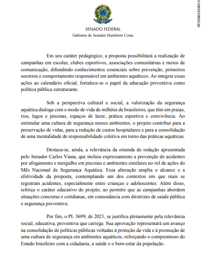 Em seu parecer, Humberto Costa destacou que a iniciativa permitirá campanhas em escolas, clubes esportivos, associações comunitárias e veículos de comunicação, difundindo conhecimentos essenciais sobre prevenção, primeiros socorros e comportamento seguro em ambientes aquáticos. Para ele, incorporar essas ações ao calendário oficial fortalece a educação preventiva como política pública estruturante.