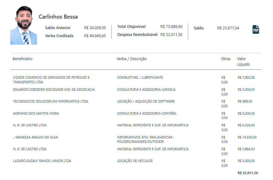 Os gastos seguem com a locação de veículos, combustível, consultorias e, principalmente, despesas com comunicação, como produção de folders, banners e outdoors. Em vários meses, esse tipo de gasto figura entre os mais altos, chegando a ultrapassar R$ 17 mil.