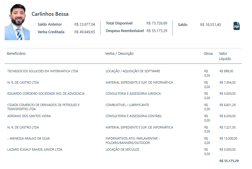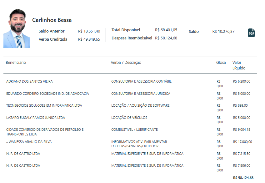 Outro ponto que chama atenção é o uso do chamado “cotão”. Ao longo de 2025, o parlamentar manteve um padrão elevado e contínuo de despesas, frequentemente consumindo grande parte da verba mensal de R$ 49,8 mil.
