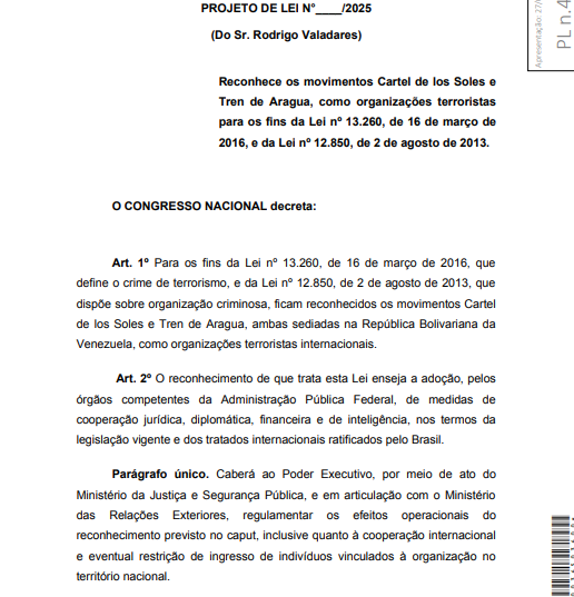 O texto aprovado é um substitutivo apresentado pelo relator, deputado Luiz Philippe de Orleans e Bragança, ao Projeto de Lei 4260 de 2025, de autoria do deputado Rodrigo Valadares. A versão original previa a classificação como terroristas apenas de dois grupos venezuelanos, o Cartel de los Soles e o Tren de Aragua.