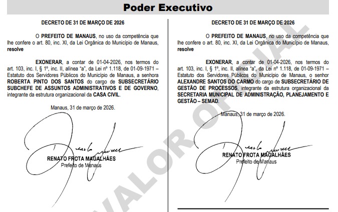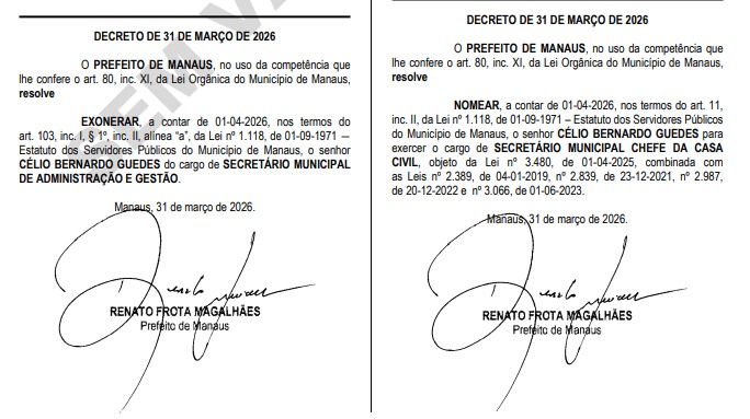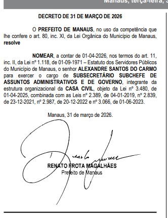 A Prefeitura de Manaus oficializou, por meio de decretos publicados nesta terça-feira (31/3), novas exonerações e nomeações que indicam mudanças na estrutura administrativa do Executivo municipal, principalmente na Casa Civil.