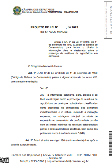De autoria do deputado Amom Mandel (Cidadania-AM), o PL 6427/25 altera o Código de Defesa do Consumidor para incluir a obrigatoriedade de transparência nos rótulos. A ideia é garantir que o consumidor tenha acesso direto a dados sobre possíveis substâncias químicas presentes nos alimentos.