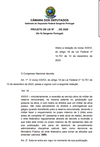 Em análise na Câmara dos Deputados, a proposta altera a Lei Orgânica Nacional das Polícias Militares e dos Corpos de Bombeiros Militares. O autor do projeto, deputado Sargento Portugal (Pode-RJ), afirma que a medida é uma resposta ao déficit de efetivo e ao aumento da criminalidade em diversas regiões do país.