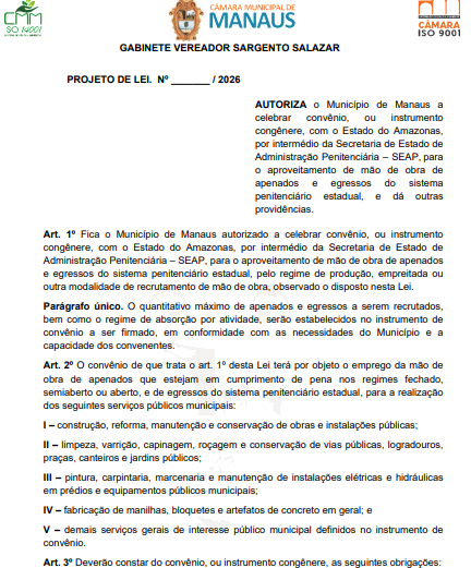 A Câmara Municipal de Manaus (CMM) analisa um projeto de lei que pode mudar a dinâmica da execução de serviços públicos na capital amazonense. De autoria do vereador Sargento Salazar (PL), a proposta autoriza o Município a firmar convênio com o Governo do Estado para utilização de mão de obra de apenados e egressos do sistema prisional.