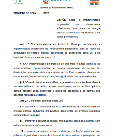 Um projeto de lei em tramitação na Câmara Municipal de Manaus (CMM) propõe uma mudança estrutural na forma como a energia elétrica é distribuída na capital amazonense. A matéria prevê a implantação progressiva de infraestrutura subterrânea para redes elétricas, com o objetivo de reduzir apagões, aumentar a segurança e melhorar o aspecto urbano de Manaus.