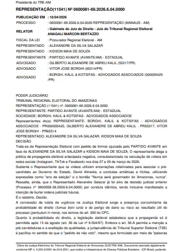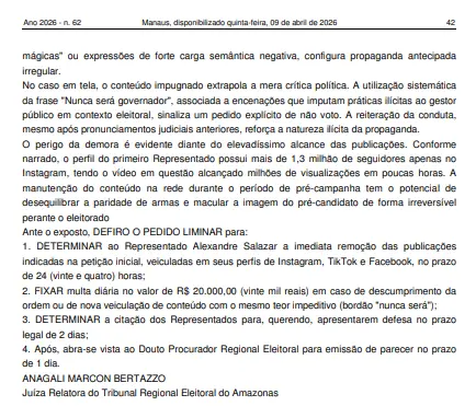 A manifestação ocorre após decisão liminar do Tribunal Regional Eleitoral do Amazonas, que determinou a retirada dos conteúdos no prazo de 24 horas, sob pena de multa diária de R$ 20 mil. A Justiça entendeu que os vídeos configuram propaganda eleitoral antecipada negativa, ao ultrapassar os limites da crítica política e associar o pré-candidato a práticas ilícitas.