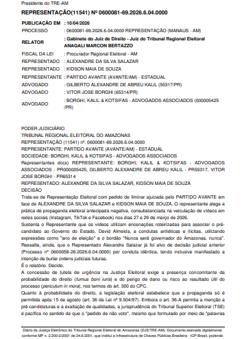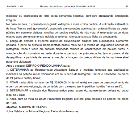 A medida liminar foi assinada pela juíza relatora Anagali Marcon Bertazzo, do Tribunal Regional Eleitoral do Amazonas (TRE-AM), após representação do partido Avante. A sigla acusa os dois de promover propaganda eleitoral antecipada negativa por meio de vídeos divulgados no Instagram, TikTok e Facebook nos dias 27 e 29 de março de 2026. A publicação foi feita nesta sexta-feira (10/04).