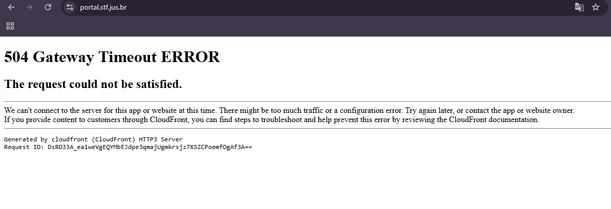 “Erro 504 Gateway Timeout. A solicitação não pôde ser atendida. Não conseguimos conectar ao servidor deste aplicativo ou site no momento. Pode haver muito tráfego ou um erro de configuração. Tente novamente mais tarde ou entre em contato com o proprietário do aplicativo ou site. Se você fornece conteúdo para clientes por meio do CloudFront, pode encontrar etapas para solucionar e ajudar a evitar esse erro consultando a documentação do CloudFront”