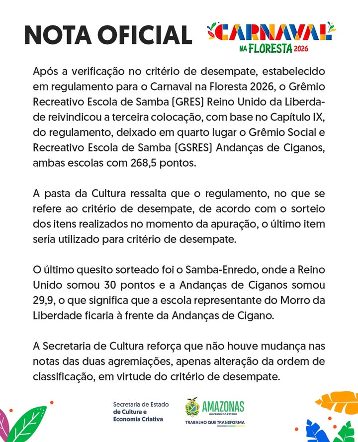 Após aplicação do critério de desempate previsto no regulamento do Carnaval na Floresta 2026, a escola de samba Reino Unido da Liberdade assumiu a terceira colocação na classificação geral do Grupo Especial. A mudança deixou o Grêmio Recreativo Social Escola de Samba Andanças de Ciganos em quarto lugar. As duas agremiações terminaram a apuração empatadas com 268,5 pontos.