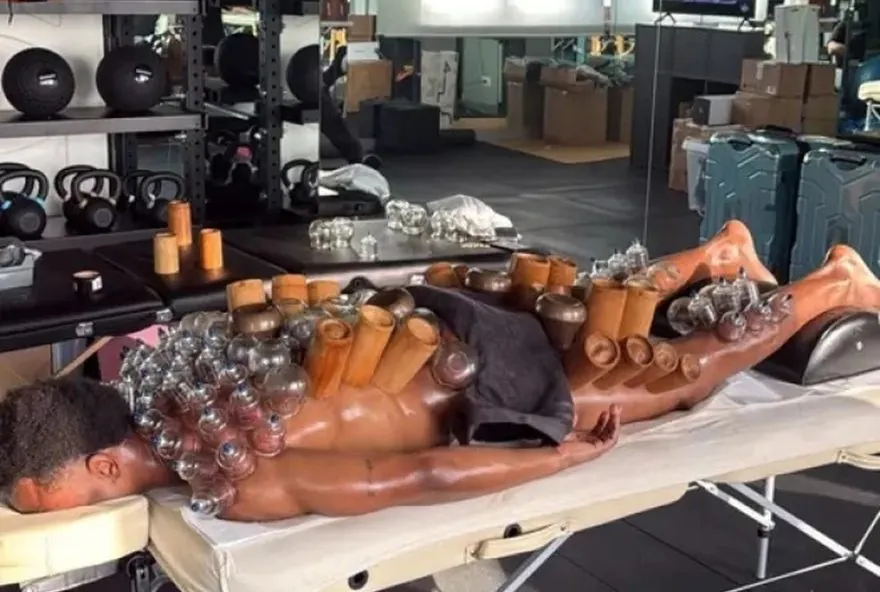 Segundo o jornal Marca, o procedimento visto nas imagens é a terapia com ventosas, uma técnica utilizada para estimular a circulação sanguínea e auxiliar na recuperação muscular.